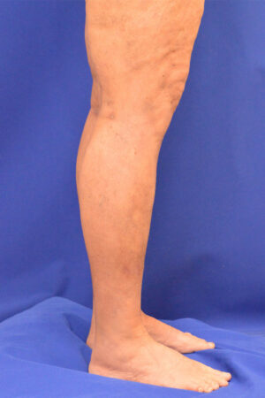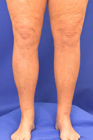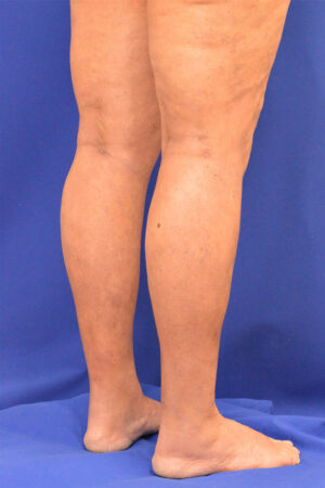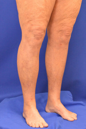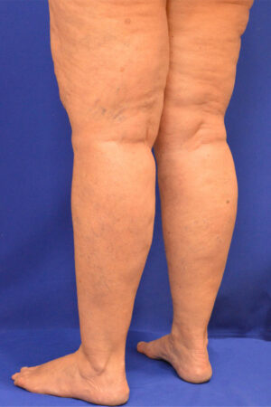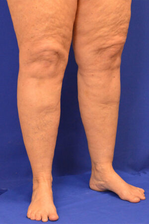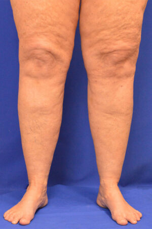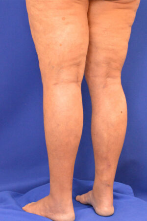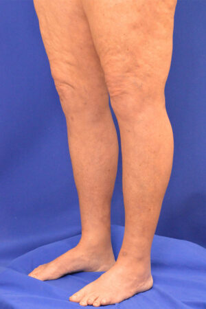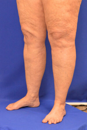 This middle-aged lady was recently diagnosed with lipedema. Her main complaints were the areas around the knees and thighs. She elected to undergo liposuction of areas around and below bilateral knees and thighs. Post-operatively, she followed instructions diligently and wore the recommended compression. At the last follow up visit she stated : “I do not know where these legs came from but I will keep them.” The photographs depict her 6 week result. Notably, not only she is very pleased with her results but also the standing position of her feet has changed since the surgery and is now more anatomically correct.